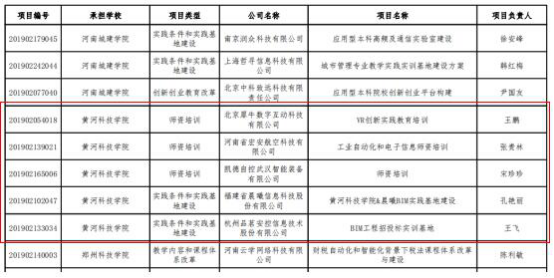 本次所获批产学合作协同育人项目中,包括三项团队培训项目与两项实践条件与实践基地建设项目。团队培训项目分别是与北京犀牛数字互动科技有限公司合作的“VR创新实践教育培训”项目,与河南省宏安航空科技有限公司合作的“工业自动化和电子信息团队培训”项目以及与凯德自控武汉智能装备有限公司合作的“团队培训”项目;实践条件与实践基地建设项目分别是与福建省晨曦信息科技股份有限公司合作的“beats365中文官网&晨曦BIM实践基地建设”项目以及与杭州品茗安控信息技术股份有限公司合作的“BIM工程招投标实训基地”项目。