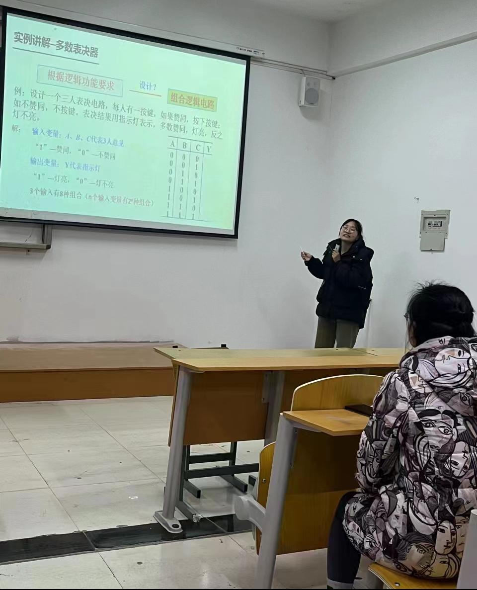 在今天的课堂教学展示环节,有三位新进教师进行了授课展示。首先展示的是来自机电教研室的李鹏飞老师,他给大家带来的是关于戴维宁定理和诺顿定理的讲解。李老师首先从两项定理中包括的二端网络这一重要概念入手,引出了两项定理的基本内容并进行了分析,之后通过一个例子具体示范了定理的具体应用。展示过后,贾乐乐老师和孔艳丽处长从课程设计,内容深浅的把握和互动环节的设置等三个方面进行了点评;接下来是来自电气教研室的卢澎澎老师和宋景慧老师进行展示。卢澎澎老师选取的教学内容为电流互感器。他以伦.赖特关于外科医生的引述为喻,讲解了电流互感器在电路分析中的作用,它的内部结构,极性与标识以及三个额定参数。最后分析了电流互感器与继电保护的接线关系。内容详实,具有很强的挑战性。李攀攀老师在展示之后对卢澎澎老师在个别概念表述的清晰程度上提出了自己的建议。张毅教授也对卢澎澎老师的教姿进行了具体指导;第三位进行教学展示的宋景慧老师,她在切入今天的主题“组合逻辑电路的设计”之前,首先明确了课程的目标及重难点。宋老师引入了三种基本门电路作为铺垫,以多数表决器为例,具体讲解了其设计过程,最后对设计步骤进行了归纳和升华。赵保强老师在点评中建议在教学过程可以考虑融入课程思政的元素,如集成块的内容