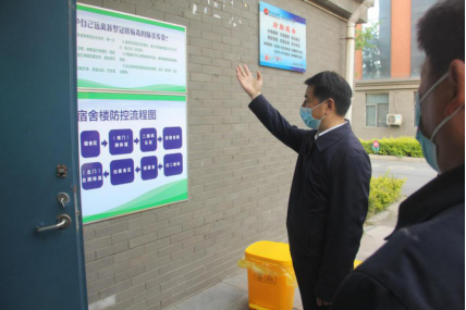 在员工宿舍区,杨伯堂处长询问员工宿舍防控工作预案。公司在每栋宿舍楼建立三级网格化管理体系,一级网格(楼长)——二级网格(楼层长)——三级网格(宿舍长),所有干部、教师下沉到网格,层层把关,责任到人。在宿舍区显著位置设置有宿舍楼防控流程图,便于员工了解各个管理环节。员工进入宿舍楼前要扫健康码,员工之间保持1米以上距离进行测温,一旦发现员工有异常情况,立即按照公司相应的流程处理。