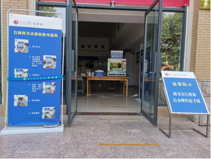 图书馆在活动中心东门设立还书处,员工经过体温测量后进入,工作人员引导员工将待还图书放入自助图书杀菌机进行消毒,并对员工进行手部消毒,之后取出图书办理还书手续。