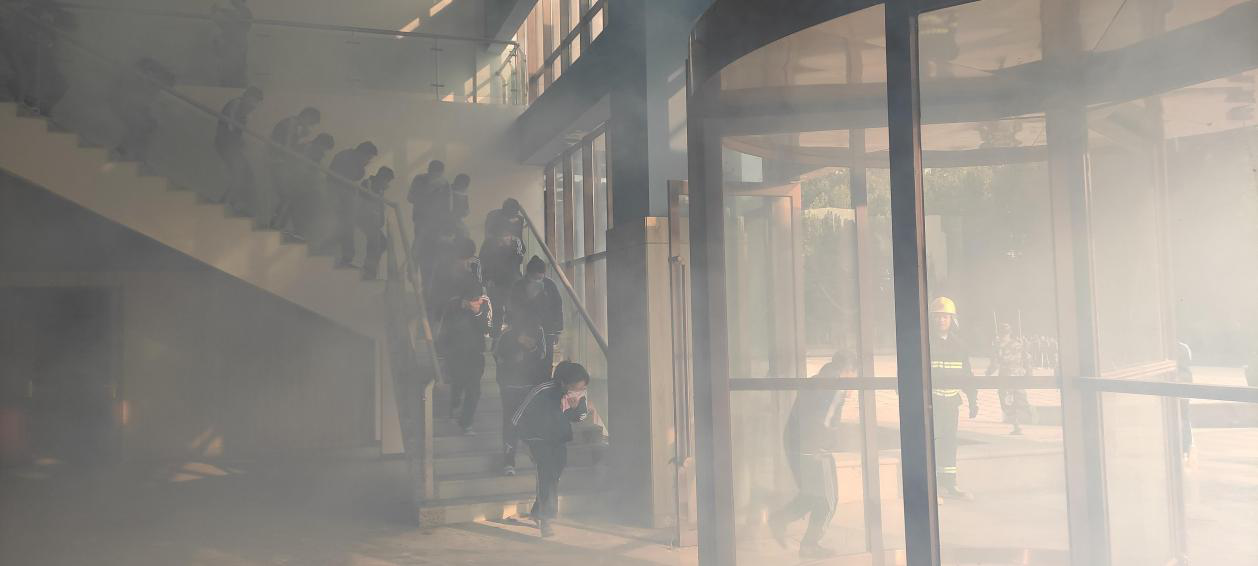 模拟火灾的烟雾点燃后,火警警报自动拉响,楼道口弥漫着白色浓烟,同学们在微型消防站队员的带领下,按照演练规定的路线,根据训练消防疏散动作要求,用湿毛巾捂住口鼻,迅速有序地从培训交流中心楼内撤离到安全地带。楼内疏散人员按照消防演习方案组织员工疏散,保证员工安全,避免出现拥挤或者踩伤员工现象。整个疏散过程在3分钟内完成,1000多名员工安全有序到达安全地带。