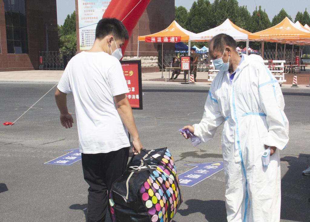 为了提高防疫工作效率,校门通道入口设有红外测温仪,经过测体温和行李消毒后方可进入校园。