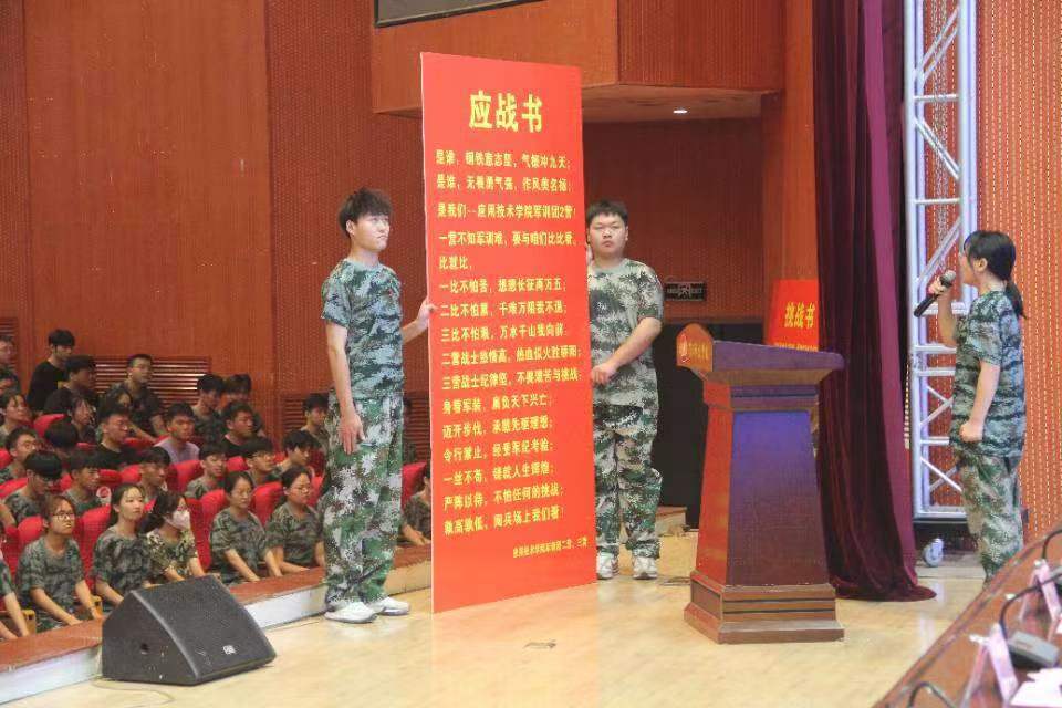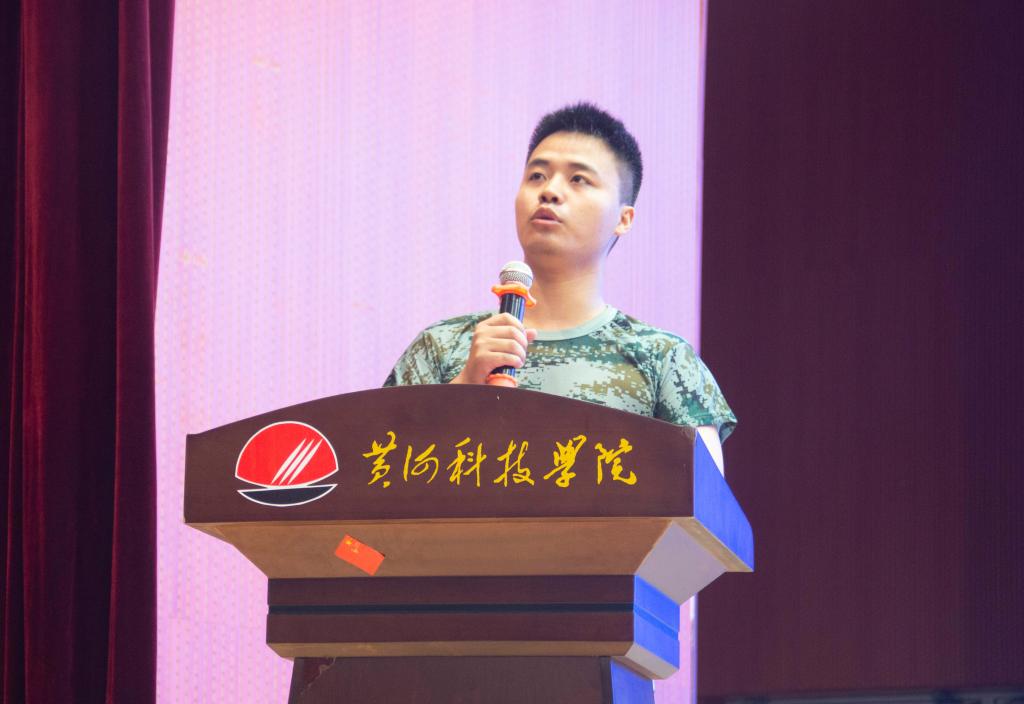 2023级材料专业殷豪代表全体参训新生发言,表示要通过军训磨练意志、增强组织纪律性,培养吃苦耐劳的优良品德,学习国防知识和军事技能,发扬黄科院开拓拼搏实干奉献的精神,克服万难,争创佳绩,做文武双全的青年。