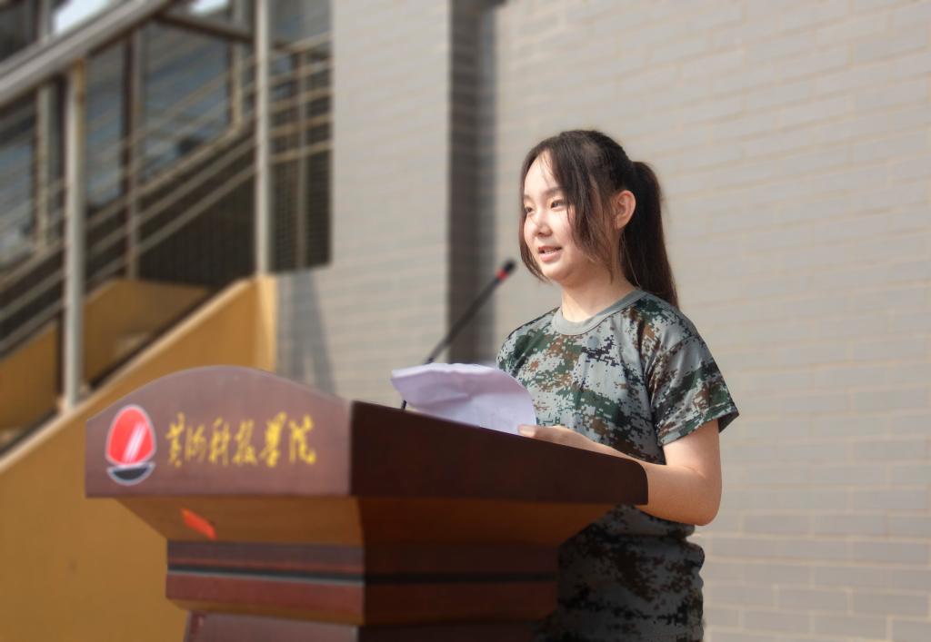 2023级工管一班闫嘉琳代表全体新生发言,她提到军训期间的酸甜苦辣,感受到军人的纪律与担当,在未来的学习生活中,她希望与同学们一道砥砺前行、钻研学习、脚踏实地、独立自强,将用坚毅、勇敢来书写奋斗的足迹。