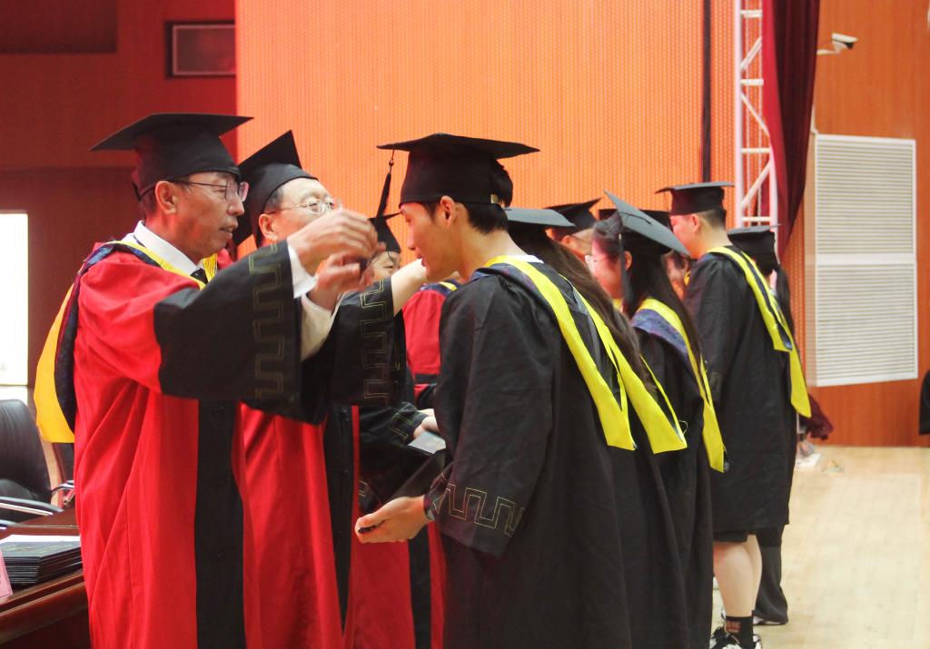 在全场的热烈掌声中,与会领导为毕业生代表正冠拨苏、颁发学士学位证书。