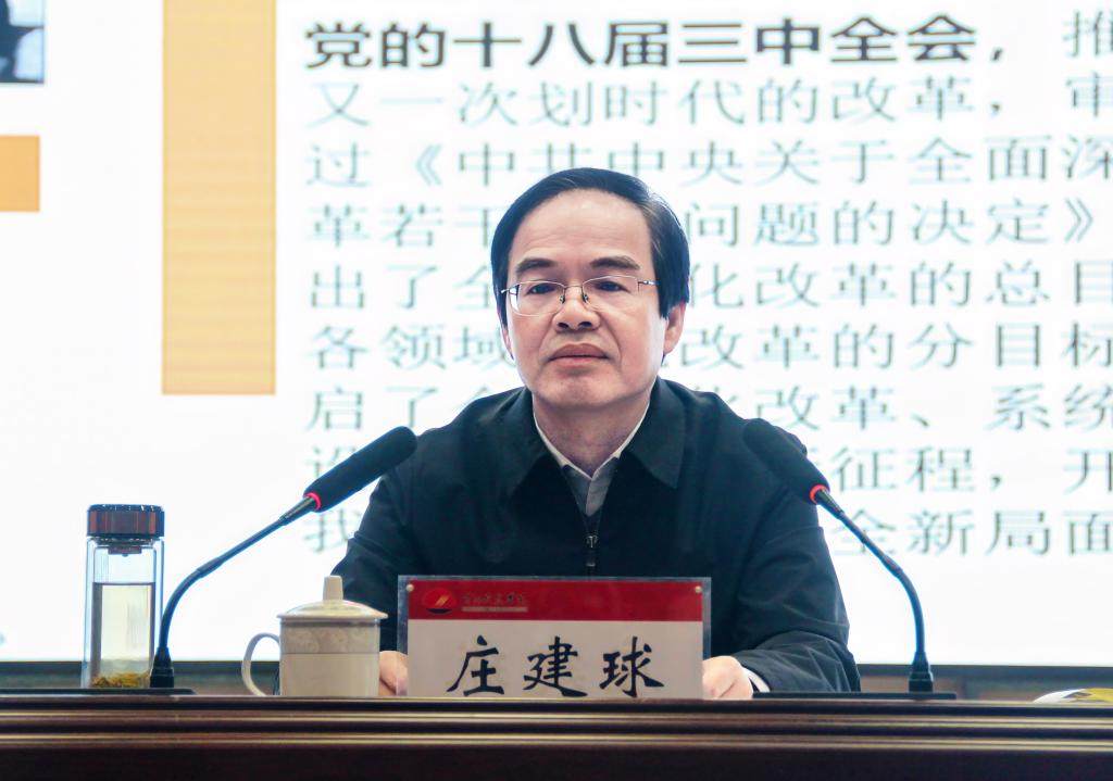 庄建球书记以《深入学习宣传贯彻党的二十届三中全会精神 以进一步全面深化改革推进中国式现代化伟大实践》为题,深入阐释了党的二十届三中全会精神。他指出,党的二十届三中全会紧紧围绕推进中国式现代化主题,对进一步全面深化改革作出了战略部署,充分体现了以习近平同志为核心的党中央坚持和完善中国特色社会主义制度、推进国家治理体系和治理能力现代化的历史主动,以进一步全面深化改革开辟中国式现代化广阔前景的坚强决心。要深刻领会和把握进一步全面深化改革的重大意义、目标要求、重大原则、科学方法和根本保证,积极探索,勇于超越,在中国式现代化建设的宽阔舞台上绽放属于自己的光彩。