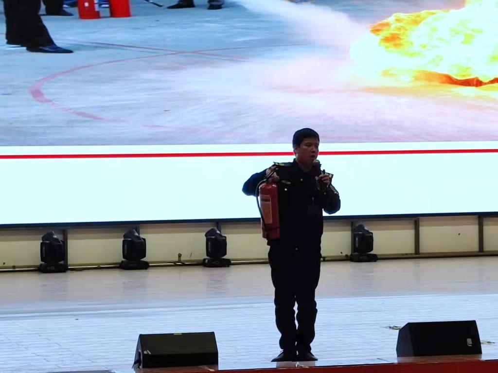 在消防器材培训环节,消防宣传员现场讲授如何开展自查自纠消除火灾隐患,并演示灭火器的使用方法。