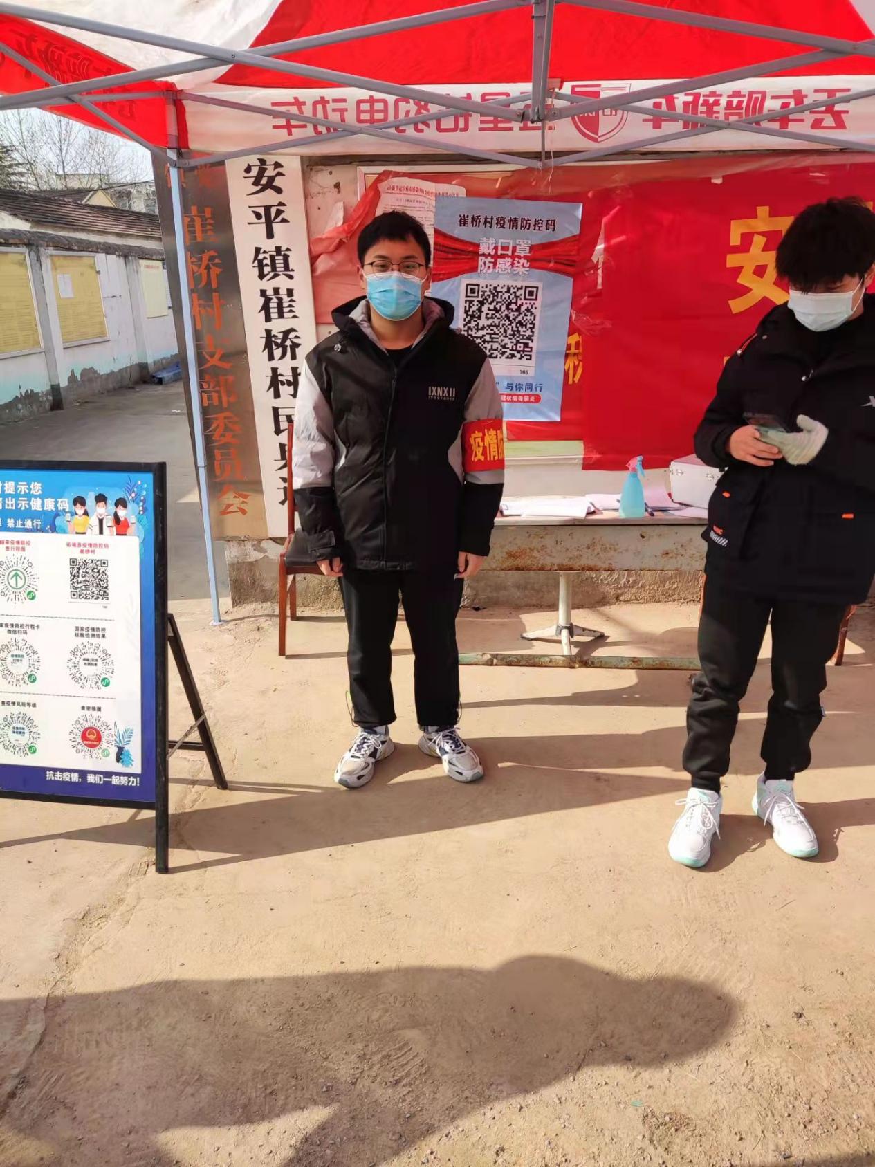 河南省突发疫情,为排查潜在人员感染者,防止疫情疫情恶化,景庄村需要需要志愿者排查来往车辆,出行码和健康码,外地车辆不允许入内。2019级机械电子工程专业的董亚林,听说大队召集志愿者时,立刻前来报名,在卡点处认真负责的排查过往人员和车辆,每天从早上七点排查到晚上七点,天气很冷,但他依然坚持。
