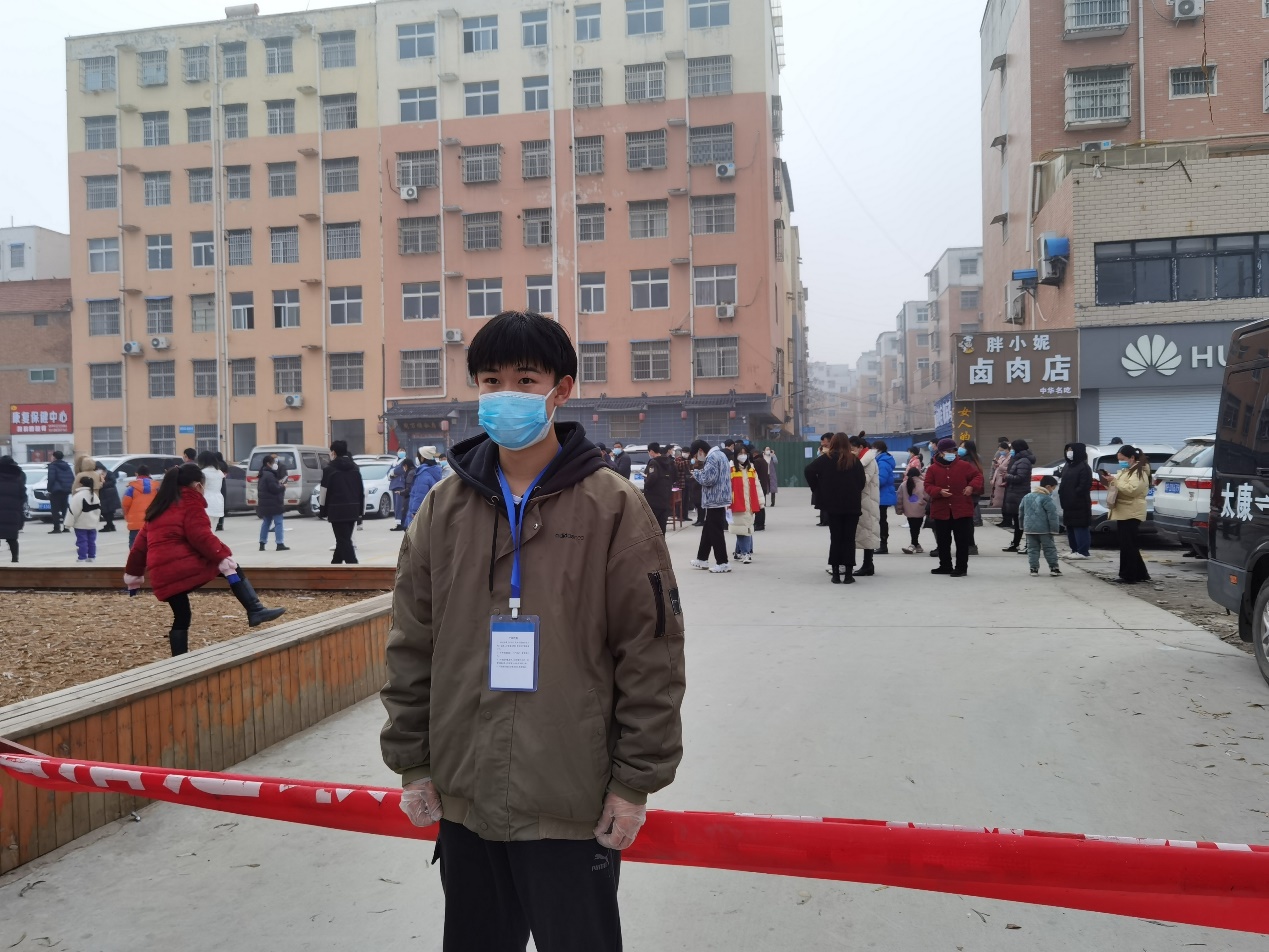 寒假放假回家,本应该安心过年,但河南省禹州市突发疫情再次成为了中高风险地区,每日新增病例逐渐提高,禹州市再次停下它的脚步。政府迅速展开措施排查各个村、社区潜在人群接触感染者,禹州市持续开展全员近八次核酸检测,因村中村民较为分散,人比较多,需要志愿者维持各项秩序,帮助前来核酸检测的村民扫码登记信息,同时帮助一些没有手机的老年人获得核酸二维码,并将每个人的信息确认正确无误。楚建博立即报名参加,他说,每天早上七点就要出门到村部,早晨或半夜做核酸检测的时候,寒风吹的手和腿都是僵硬的,但必须要坚持扫码登记。“间隔一米”“出示二维码”“排好队”等这些话每天要重复几百遍,有很多不了解的居民和年龄比较大的人,要跟他们解释很多遍该做什么,小朋友们没有身份证,要一个字一个字去输入他们的信息,做完核酸之后就要将每个人的信息登录到电脑上,有次整理信息到凌晨一点,期间他们跟着村里的队长一起下乡入户排查登记坚决不漏一户不漏一个人,要确保所登记的人能够参加每次的核酸。印象当中最深的一次就是第二次做核酸,下着大雪,医生在帐篷内做核酸,他坐在帐篷外顶着雪登记,在回家的路上,寒风依旧很冷,腿觉得很累,但是在一天充实核酸过程中,父老乡亲们对他默默的称赞和对他说的“谢谢啊”“辛苦了啊”,还在寒风中递给他的一双手套,将一切辛苦都化为乌有,他心里面感觉这所有的一切都很值得,很有意义!